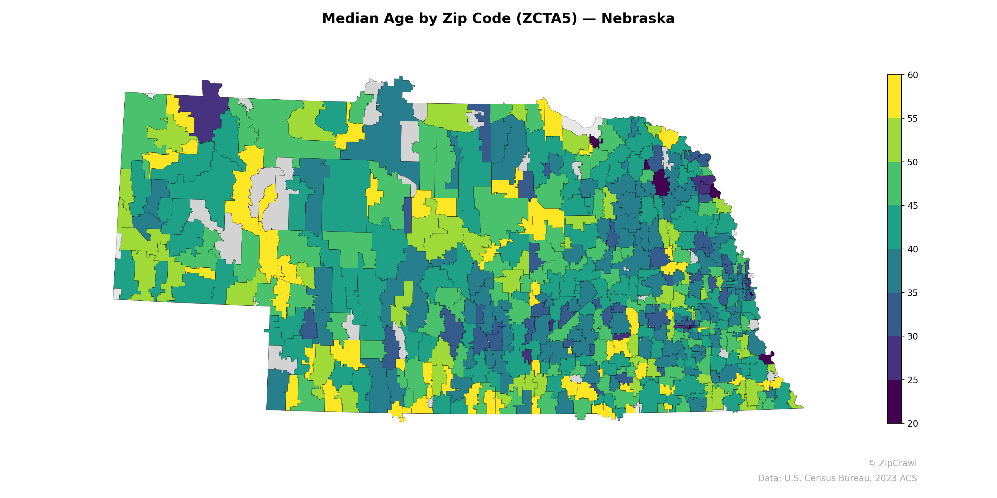 Nebraska's median age distribution reveals a clear urban-youth pattern, with the Omaha metropolitan area in the east and Lincoln showing notably lower median ages (dark teal/purple tones, roughly 25–35), consistent with concentrations of universities and younger working-age populations. Rural western and central Nebraska zip codes skew considerably older, with numerous areas reaching median ages of 50–60 (yellow tones), particularly in the Sandhills region and along the northern border. Scattered pockets of very low median ages in south-central Nebraska likely correspond to meatpacking and agricultural processing communities that attract younger immigrant labor forces.