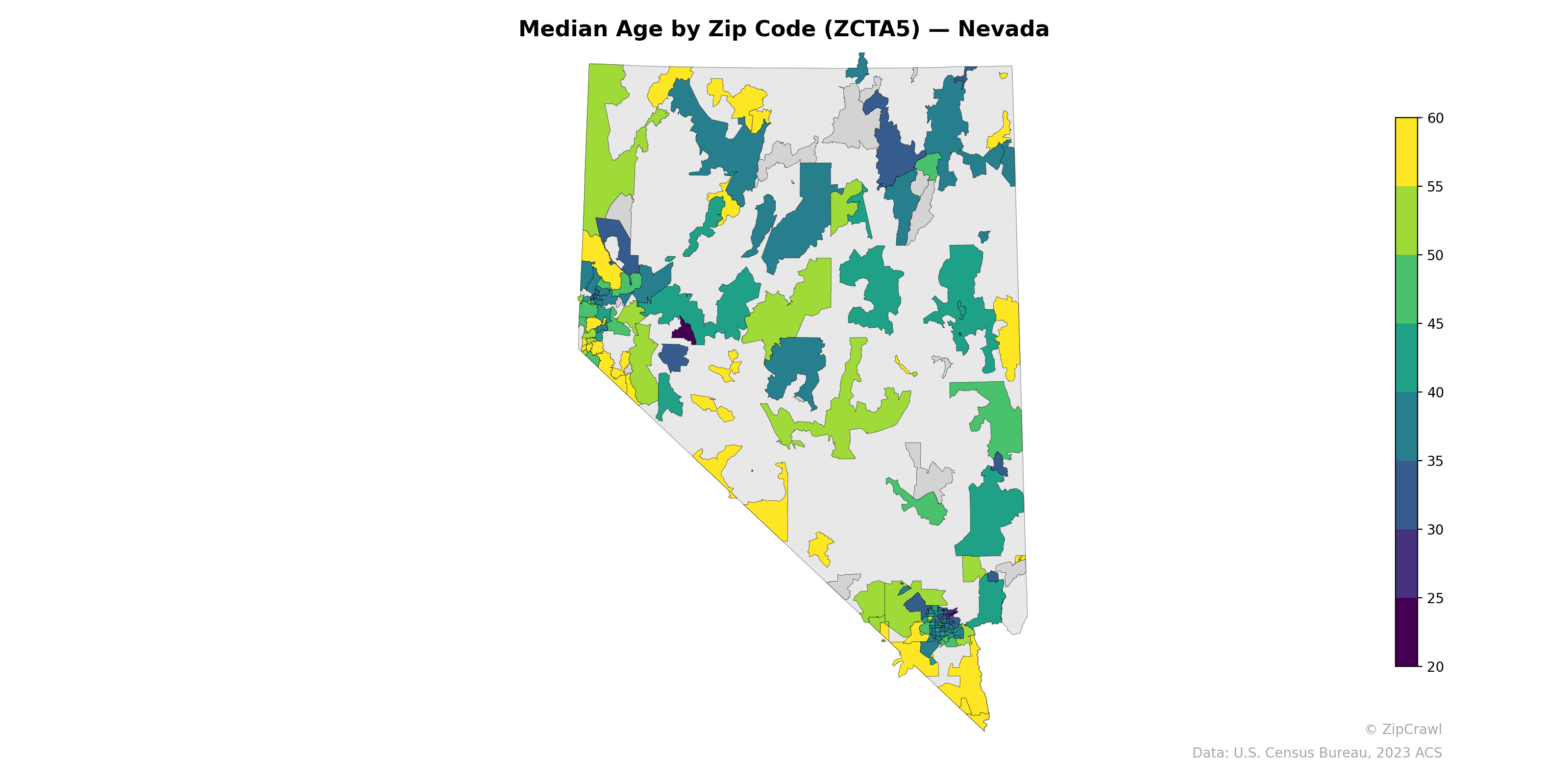 The Las Vegas metropolitan area in southern Nevada displays notable internal variation, with several zip codes near the urban core registering median ages below 25—among the youngest in the state—while surrounding suburban communities trend into the mid-30s to low 40s. Rural zip codes across central and northern Nevada generally skew older, with several areas in the northeastern corner and along the western border exceeding median ages of 55 to 60, likely reflecting retirement-oriented or sparsely populated communities. The Reno-Sparks area in the northwest shows moderate median ages in the 35–45 range, contrasting with adjacent rural zip codes that tend toward higher values.