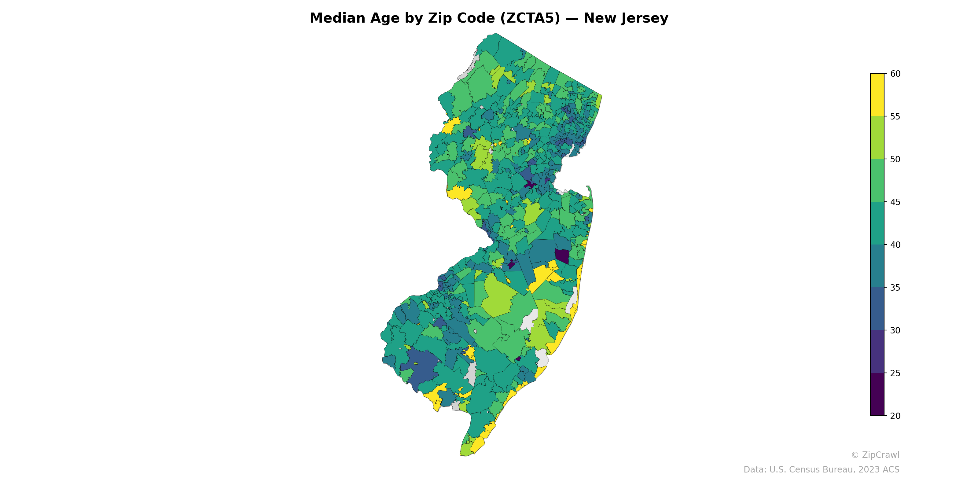 Northern New Jersey's suburban zip codes, particularly in Bergen, Morris, and Sussex counties, tend to skew older with median ages frequently in the 45–55+ range, reflecting established family and retirement-age communities. In contrast, urban cores around Newark, Jersey City, New Brunswick, and Trenton display notably younger median ages in the 25–35 range, consistent with higher concentrations of young professionals, renters, and college-age populations. The southern Shore counties present a mixed pattern, with several coastal zip codes—likely retirement and seasonal communities—registering among the highest median ages in the state at 55–60+, while inland Pine Barrens areas trend younger.
