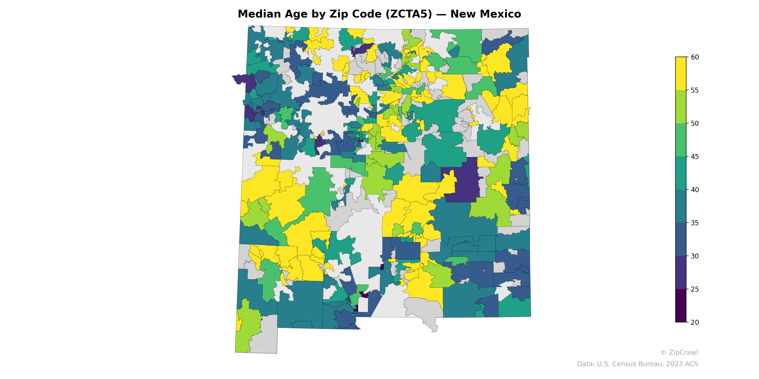 Zip codes in the northwest quadrant of New Mexico—particularly across the Navajo Nation and surrounding areas—display some of the lowest median ages in the state, frequently falling below 30, while scattered rural zip codes in the northeast and along the southern border trend notably older with median ages exceeding 55. The Albuquerque metro area exhibits considerable internal variation, with university-adjacent and urban core zip codes skewing younger against suburban areas that trend into the 40–50 range. A pronounced cluster of high median ages (55–60+) is visible along the northern tier near the Colorado border and in retirement-oriented communities in the south-central region, contrasting sharply with the youthful demographic signature of tribal lands to the west.