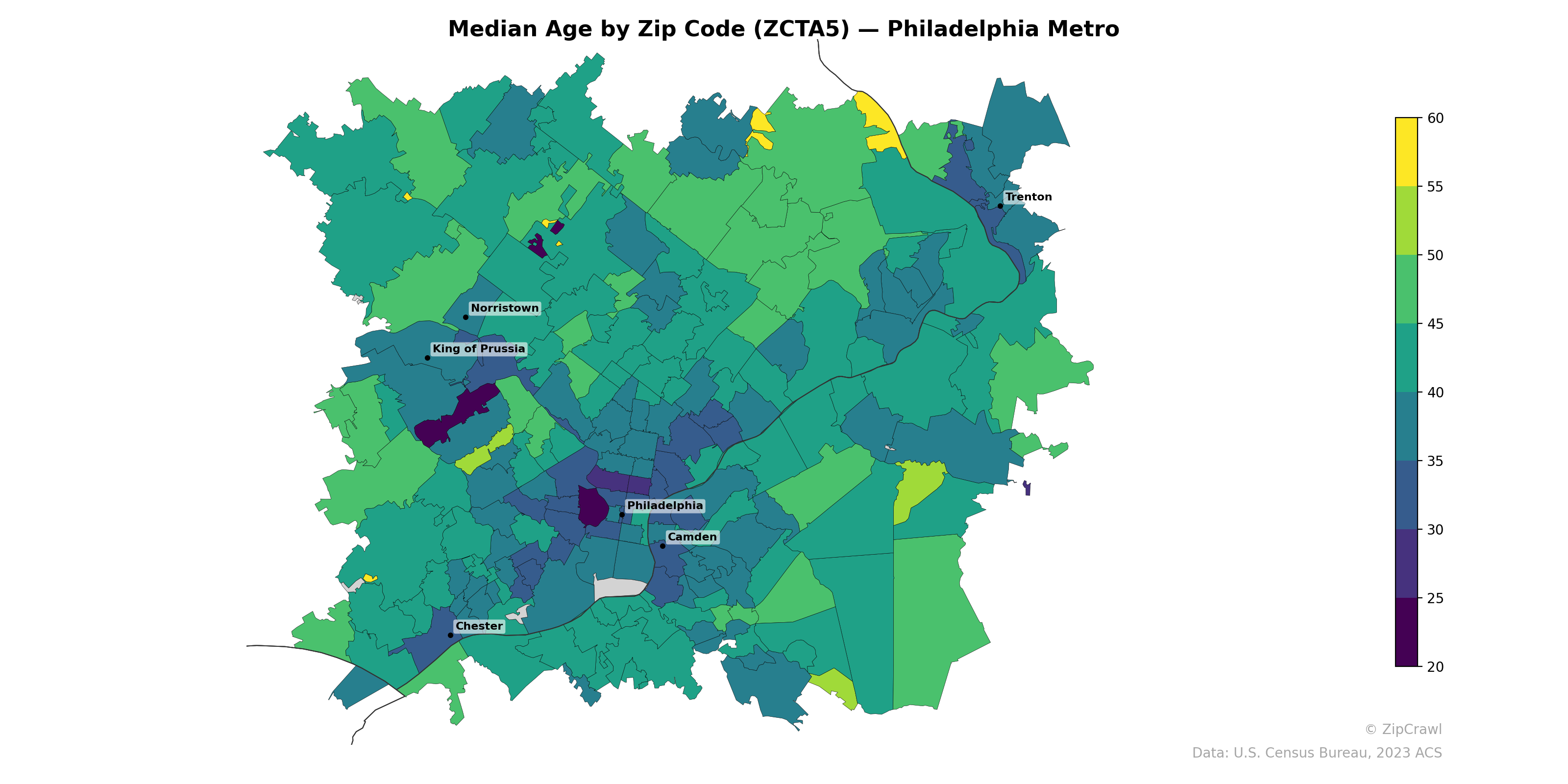 The Philadelphia metro area exhibits a clear urban-suburban age gradient, with the youngest median ages (under 25) concentrated in zip codes near central Philadelphia, Camden, and Chester—areas likely influenced by university populations and younger urban demographics. Suburban zip codes in the outer ring, particularly to the northwest and north toward Bucks County, skew considerably older with median ages reaching into the mid-40s to upper 50s, while one zip code north of Norristown stands out with a median age exceeding 60. King of Prussia and the western Montgomery County corridor display moderate median ages in the 38–45 range, forming a transitional band between the younger urban core and the older exurban periphery.