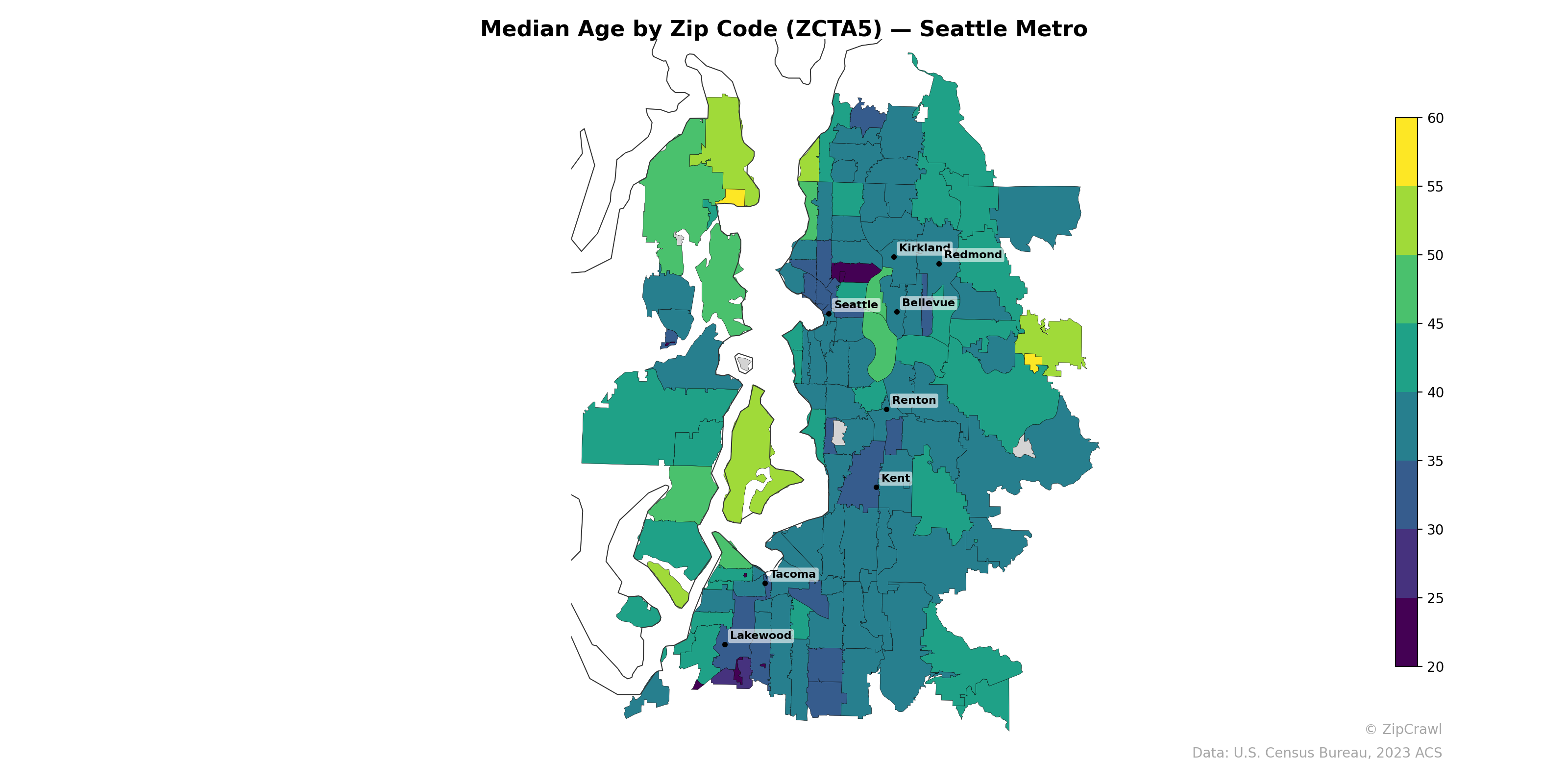 Younger median ages cluster along the central Seattle corridor and near university areas, with several zip codes in the University District and downtown falling below 30, while the southern suburbs around Tacoma and Lakewood also skew younger. The oldest populations concentrate in the northern and eastern periphery of the metro, particularly in rural and exurban zip codes north of Kirkland and east of Bellevue, where median ages exceed 50. A notable east-side outlier near the Sammamish Plateau registers among the highest median ages in the metro, contrasting sharply with the younger adjacent communities in Bellevue and Redmond.