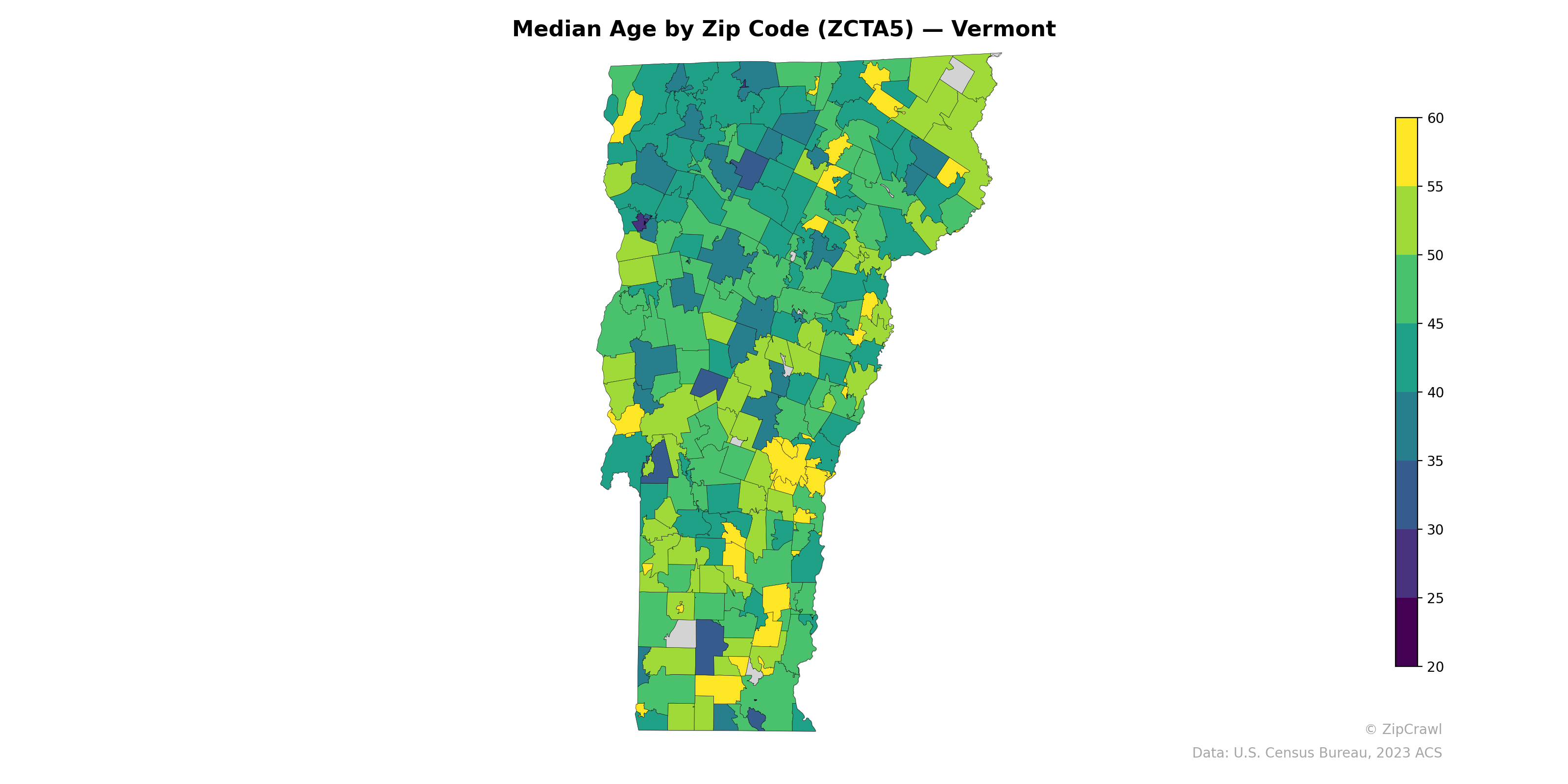 Vermont's median age landscape reveals a distinct north-south gradient, with the northern tier—particularly the Northeast Kingdom region—displaying notably higher median ages (55–60+), reflecting aging rural populations, while the southern portion of the state shows more variability with pockets of younger demographics. The Burlington metro area in the northwest and the Middlebury area stand out as younger enclaves (mid-20s to low 30s), likely driven by college-age populations at UVM and Middlebury College. A similar college-town effect appears in the southern part of the state near Bennington and Brattleboro, where isolated dark-shaded zip codes contrast sharply with surrounding areas trending into the mid-40s to 50s.