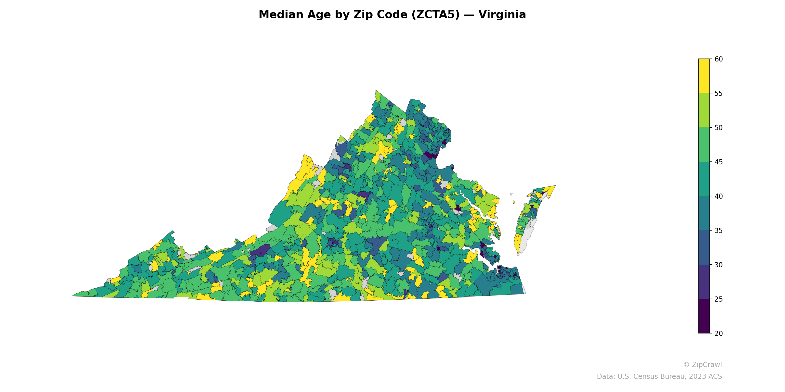 Zip codes in Virginia's southwestern Appalachian region and parts of the rural Southside consistently register median ages above 50, with several areas reaching into the upper 50s and 60, reflecting aging populations in economically declining rural communities. In sharp contrast, the Northern Virginia corridor and areas surrounding college towns like Blacksburg, Charlottesville, and Williamsburg display notably lower median ages, often in the low-to-mid 20s, driven by student populations and younger professional demographics. The Hampton Roads metro area and Richmond suburbs show moderate median ages generally in the 35–45 range, forming a transitional band between the younger urban cores and the older rural periphery.