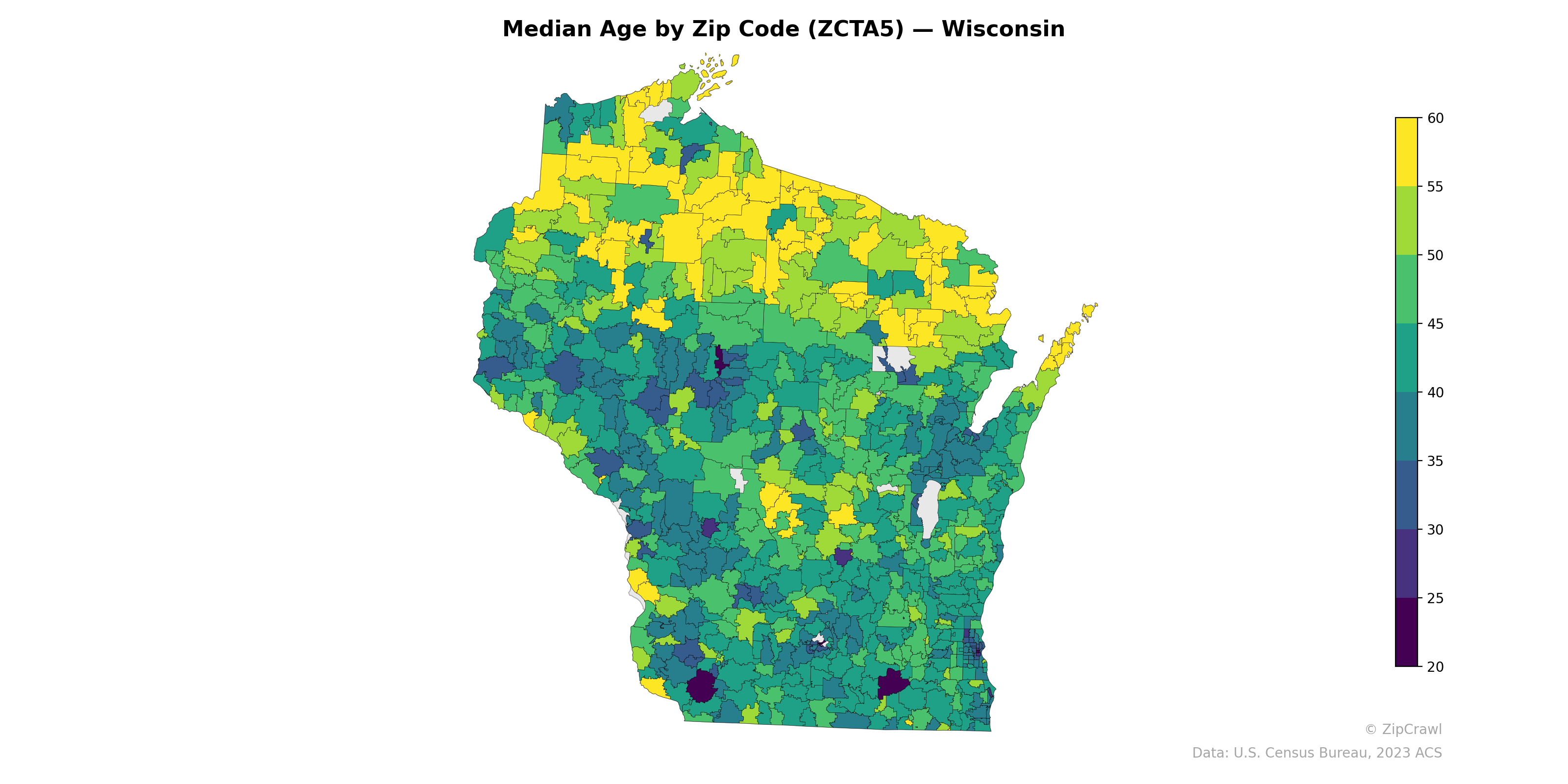 The northeastern and north-central regions of Wisconsin display notably higher median ages, with many zip codes reaching into the mid-50s to 60+, consistent with popular retirement and vacation-home areas like Vilas, Oneida, and Door counties. In sharp contrast, the Milwaukee metro area in the southeast and the Madison area in the south-central part of the state contain zip codes with the lowest median ages, dropping below 25 in several cases — likely driven by university populations and younger urban demographics. The western border counties along the Mississippi and much of the rural southwest trend toward moderate median ages in the 40–50 range, while scattered pockets of very low median age in central Wisconsin likely correspond to college towns such as Stevens Point and Eau Claire.
