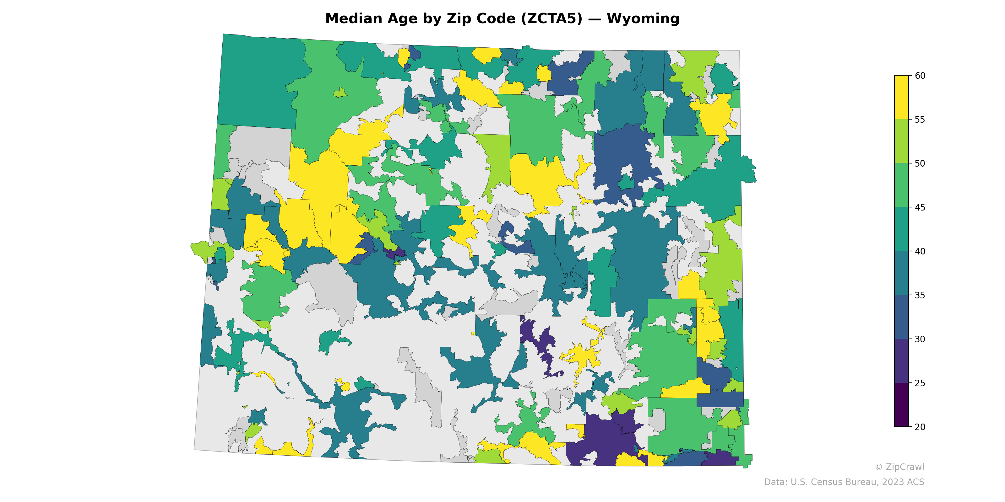 The southeastern corner of Wyoming, encompassing the Laramie area, displays notably low median ages in the high teens to mid-20s range, consistent with the presence of the University of Wyoming's student population. Northwestern zip codes near the Yellowstone and Jackson Hole corridor tend toward higher median ages in the 45–55+ range, likely reflecting retiree and second-home demographics, while scattered yellow-shaded zones across the western and central portions indicate pockets where median ages exceed 55. Central Wyoming shows considerable fragmentation, with many gray (no data) areas interspersed among zip codes that swing widely between younger and older populations, suggesting sparse and demographically variable rural communities.
