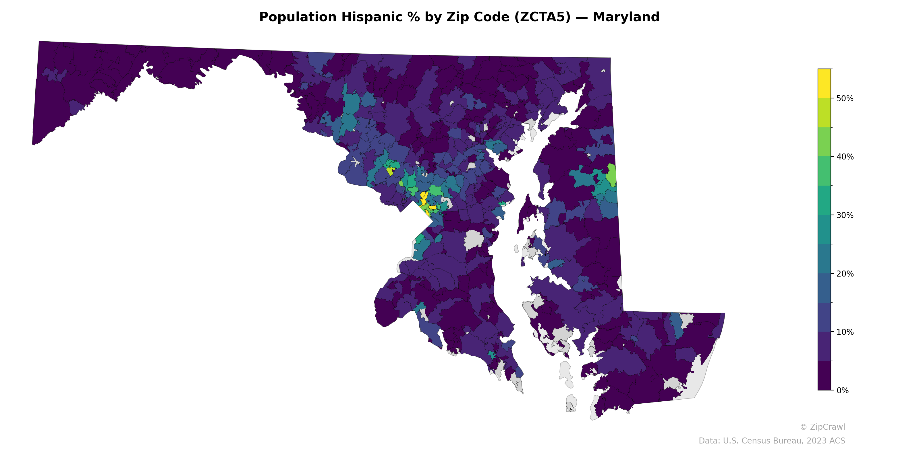 The highest concentrations of Hispanic residents, exceeding 40-50%, cluster tightly in the inner suburbs of Washington, D.C., particularly in zip codes spanning Langley Park, Wheaton, and Silver Spring in Montgomery and Prince George's counties. A secondary but notably lower concentration appears in parts of Frederick County and scattered areas along the Eastern Shore, while the vast majority of western Maryland, southern Maryland, and the lower Eastern Shore remain below 10%. The sharp contrast between the D.C.-adjacent suburban corridor and the rest of the state underscores the highly localized nature of Maryland's Hispanic population distribution.
