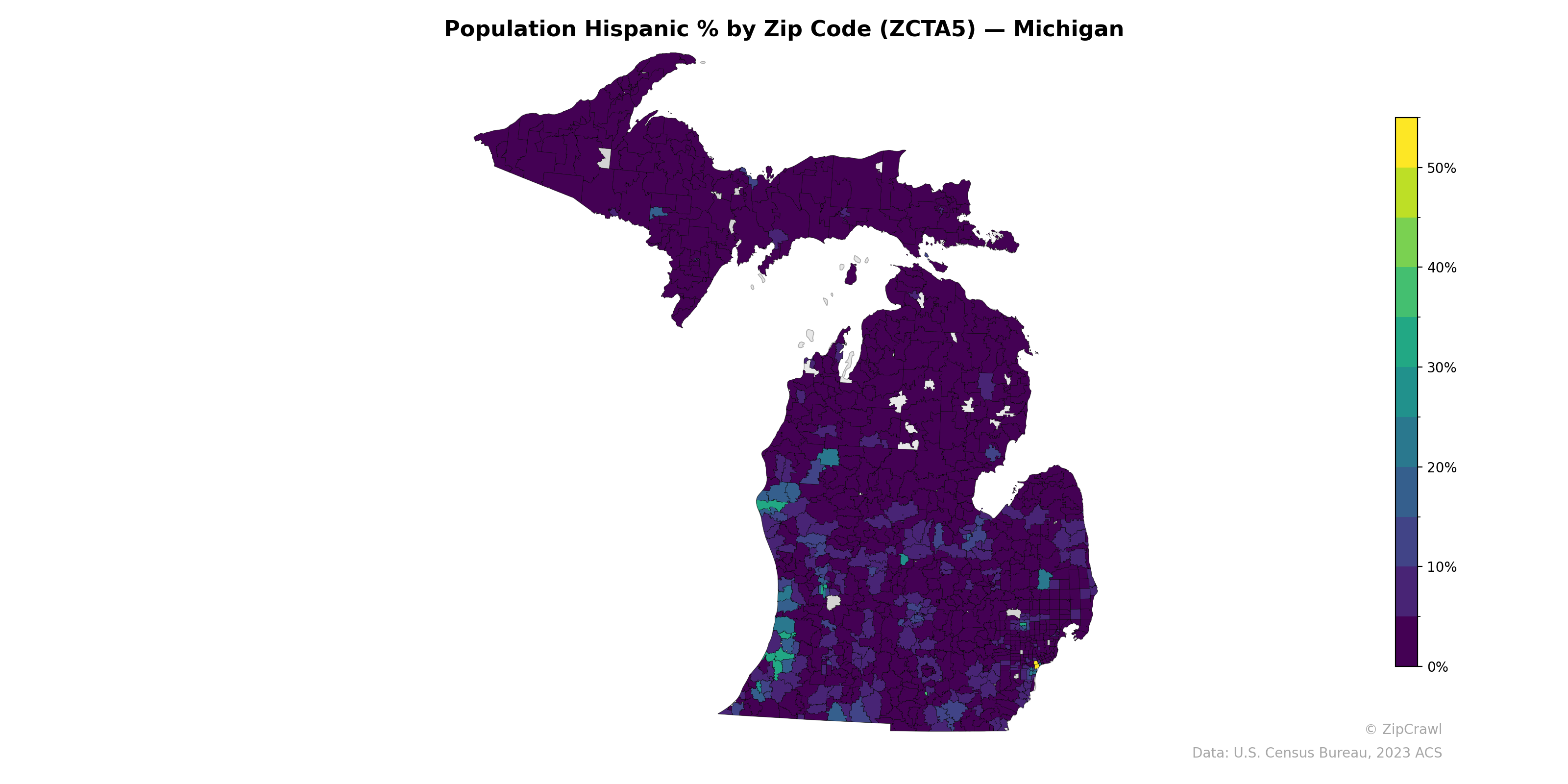 Hispanic population concentrations in Michigan are most pronounced in the southwestern Lower Peninsula, particularly in zip codes around the Holland, Grand Rapids, and Benton Harbor corridor, where several areas exceed 20–40% Hispanic population. A secondary cluster appears in the southeastern Lower Peninsula near Detroit and its surrounding communities, with scattered moderate-percentage zip codes also visible in the Saginaw–Bay City area of the central Lower Peninsula. The Upper Peninsula and northern Lower Peninsula remain overwhelmingly low in Hispanic population share, generally below 5%, creating a stark north-south demographic divide across the state.