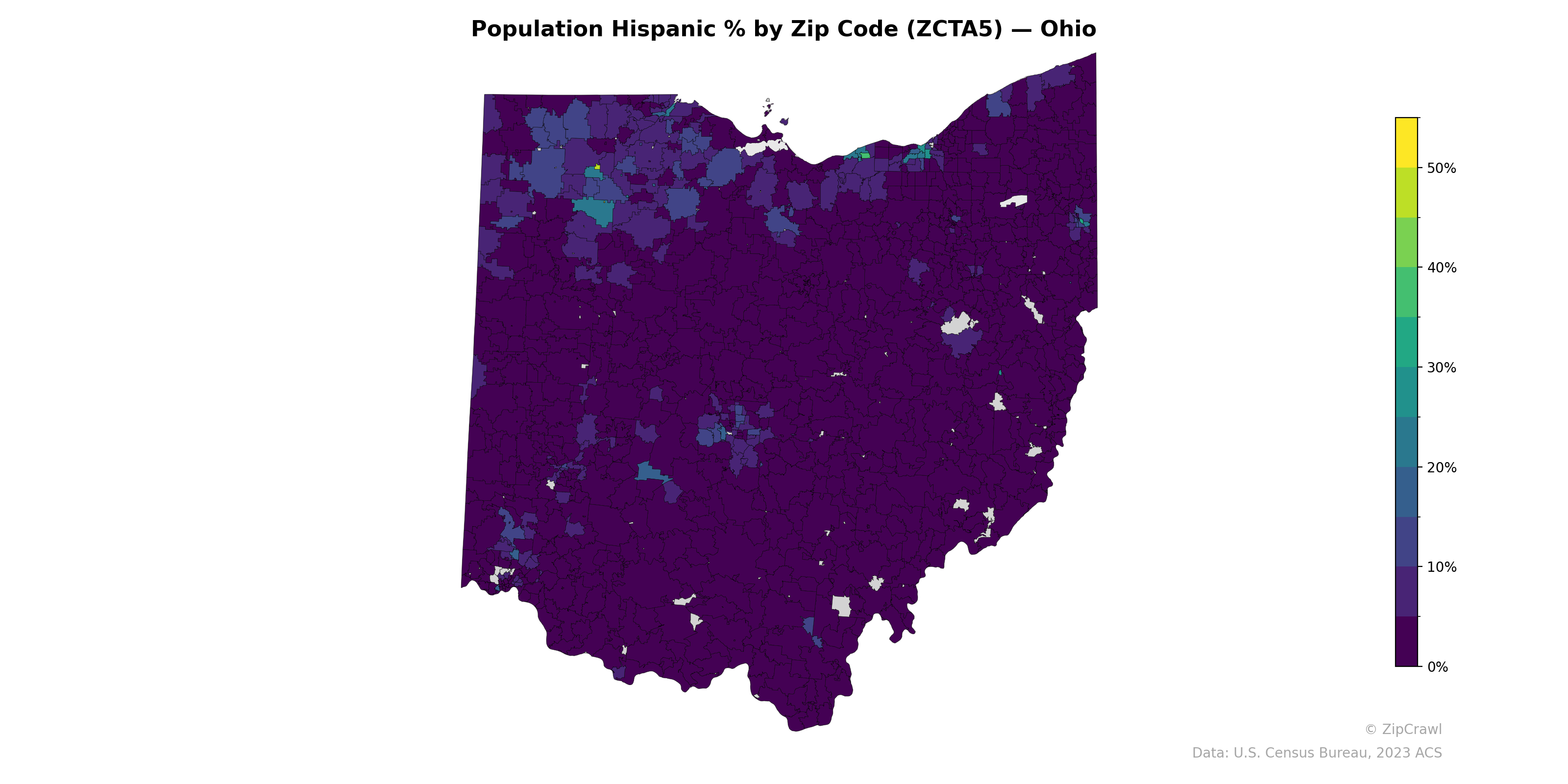 Hispanic population concentrations in Ohio are most prominent in the northwestern part of the state, particularly in zip codes around the Toledo metro area and scattered agricultural communities, where percentages reach into the 30–50%+ range. A secondary cluster of moderate Hispanic representation appears in the central-western region near Columbus and several mid-sized cities like Lorain and Painesville along the Lake Erie shoreline in the northeast. The vast majority of southern, eastern, and rural Ohio zip codes register near 0%, creating a stark contrast between isolated urban and agricultural pockets of Hispanic population and the overwhelmingly low-percentage remainder of the state.