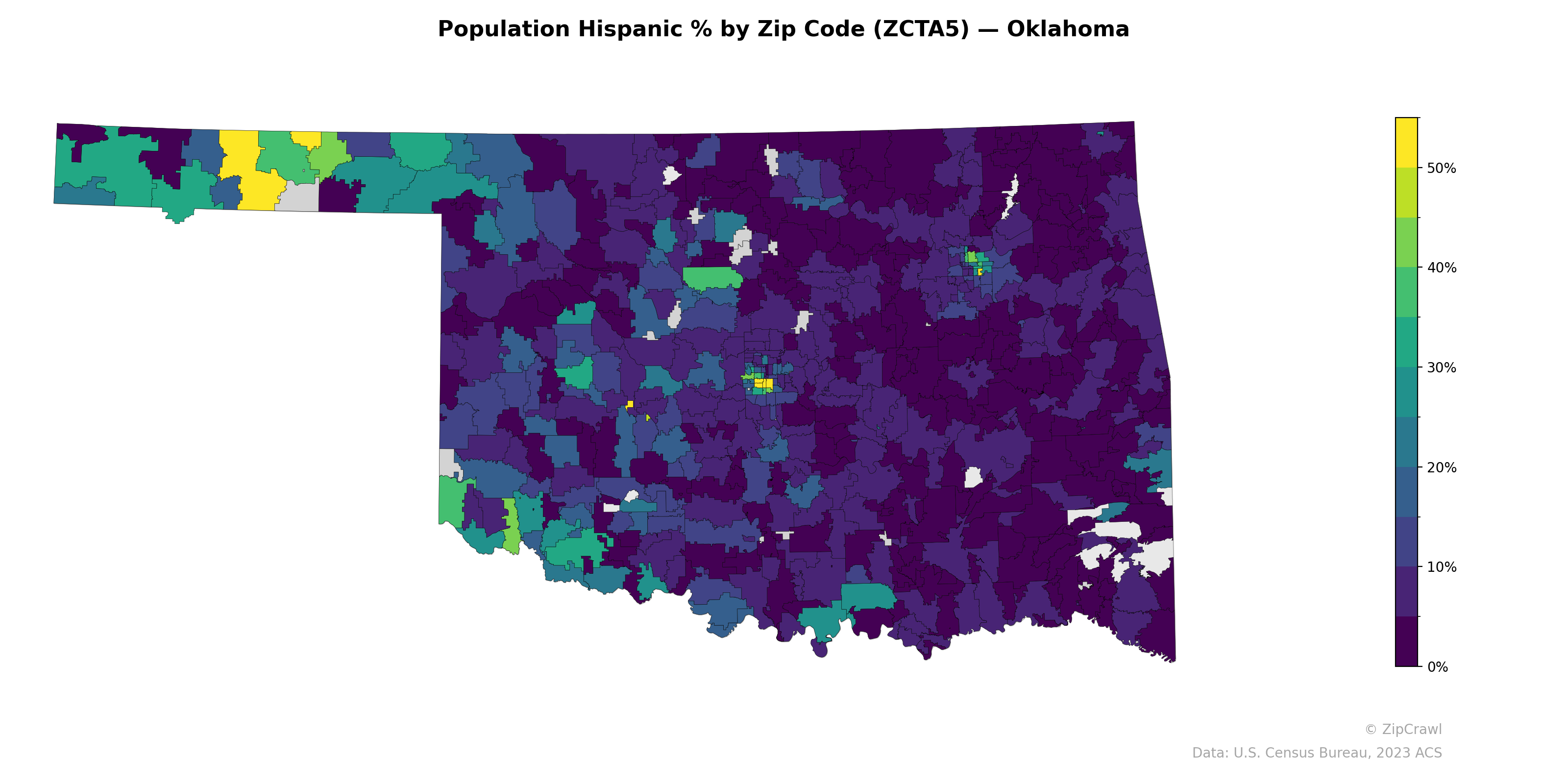 The Oklahoma panhandle and western border regions exhibit the highest Hispanic population concentrations, with several zip codes in the panhandle exceeding 40-50%, likely reflecting agricultural employment centers such as Guymon and surrounding communities. A secondary cluster of elevated Hispanic percentages appears in the Oklahoma City metropolitan area, particularly in select south-side zip codes, as well as in the Tulsa metro region to the northeast. The eastern third of the state and rural southeastern Oklahoma consistently register among the lowest Hispanic population shares, generally below 5%, creating a pronounced west-to-east demographic gradient across the state.