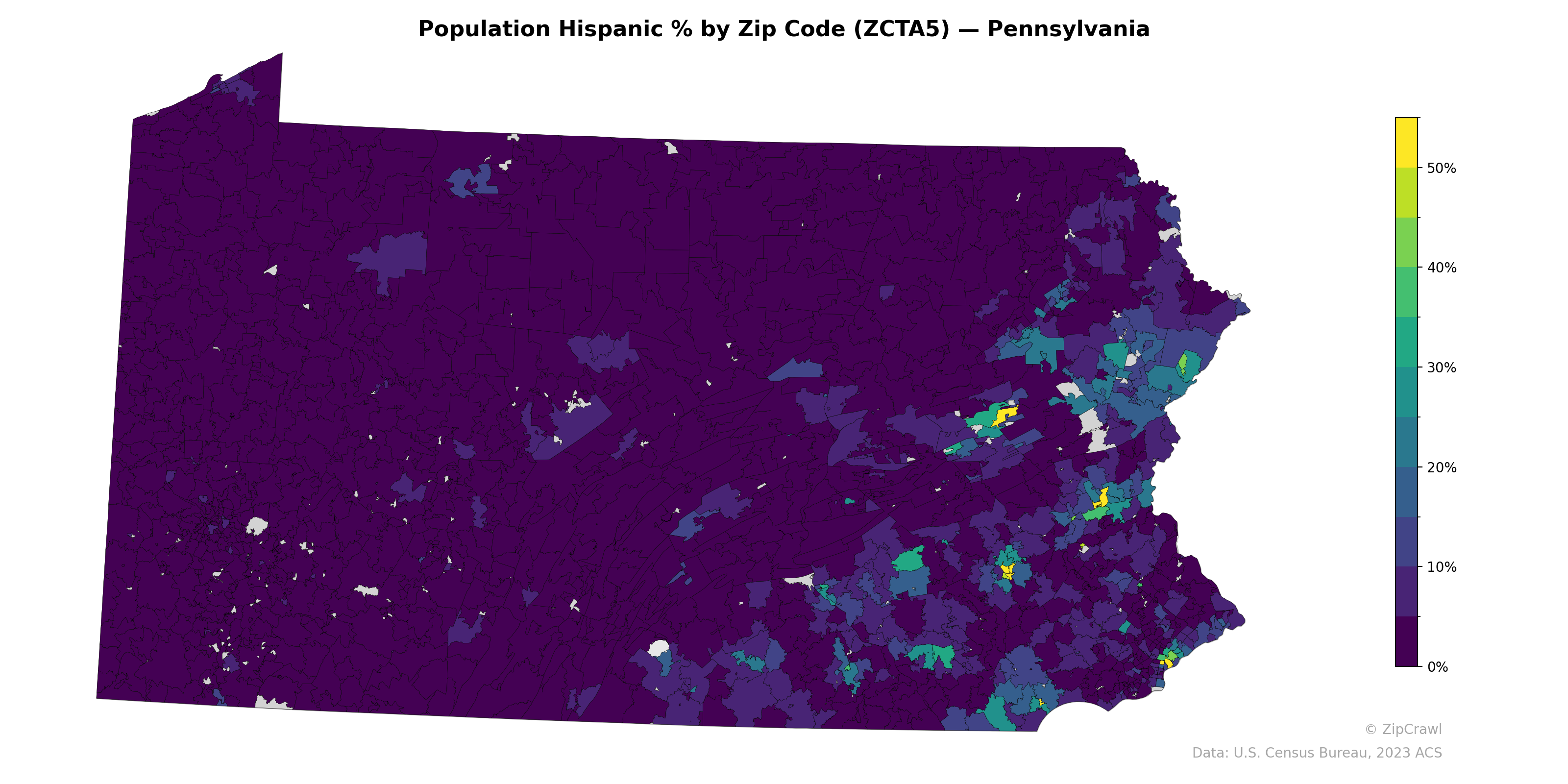 Hispanic population concentrations in Pennsylvania are heavily skewed toward the eastern portion of the state, with the highest percentages (exceeding 50%) clustered in small zip codes corresponding to cities like Reading, Allentown, Bethlehem, and Hazleton in the Lehigh Valley and surrounding region. Philadelphia and its immediate suburbs also display elevated Hispanic shares in the 20–40% range, creating a broad corridor of higher concentration across southeastern Pennsylvania. The vast majority of central and western Pennsylvania zip codes register below 5% Hispanic population, presenting a stark east-west demographic divide with only isolated pockets of moderate concentration around cities like Lancaster and York.
