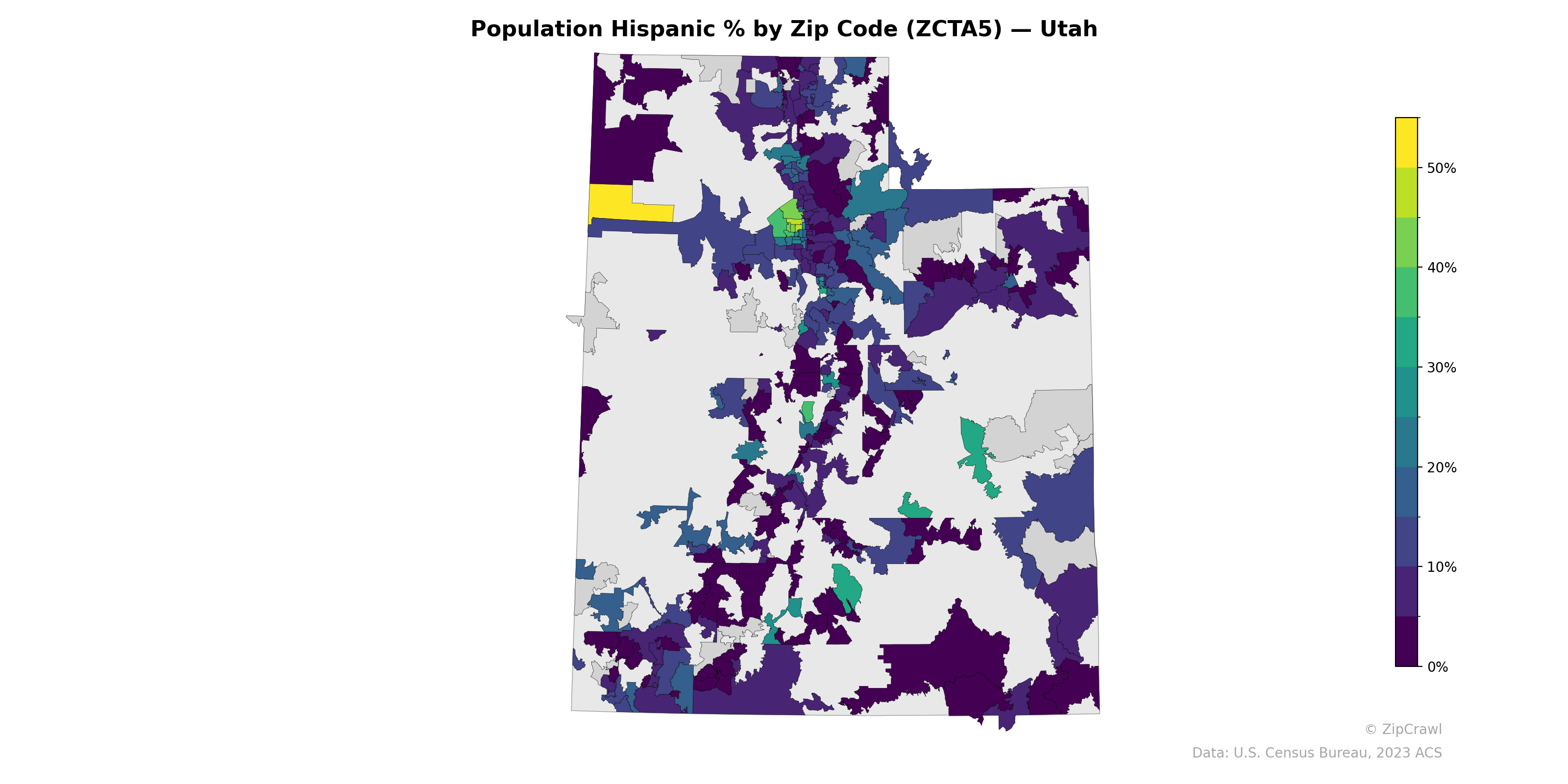 The highest Hispanic population concentrations in Utah appear in the Salt Lake City metro area, particularly in zip codes west of downtown, where percentages reach 40–55%, along with a notable yellow-shaded cluster in the northwestern part of the state near the Wendover area. A secondary corridor of elevated Hispanic percentages (15–25%) extends southward along the Wasatch Front through Provo and into central Utah's rural communities. Eastern Utah and the state's more remote rural zip codes generally exhibit the lowest Hispanic population shares, typically below 5%, creating a stark contrast with the urbanized western corridor.