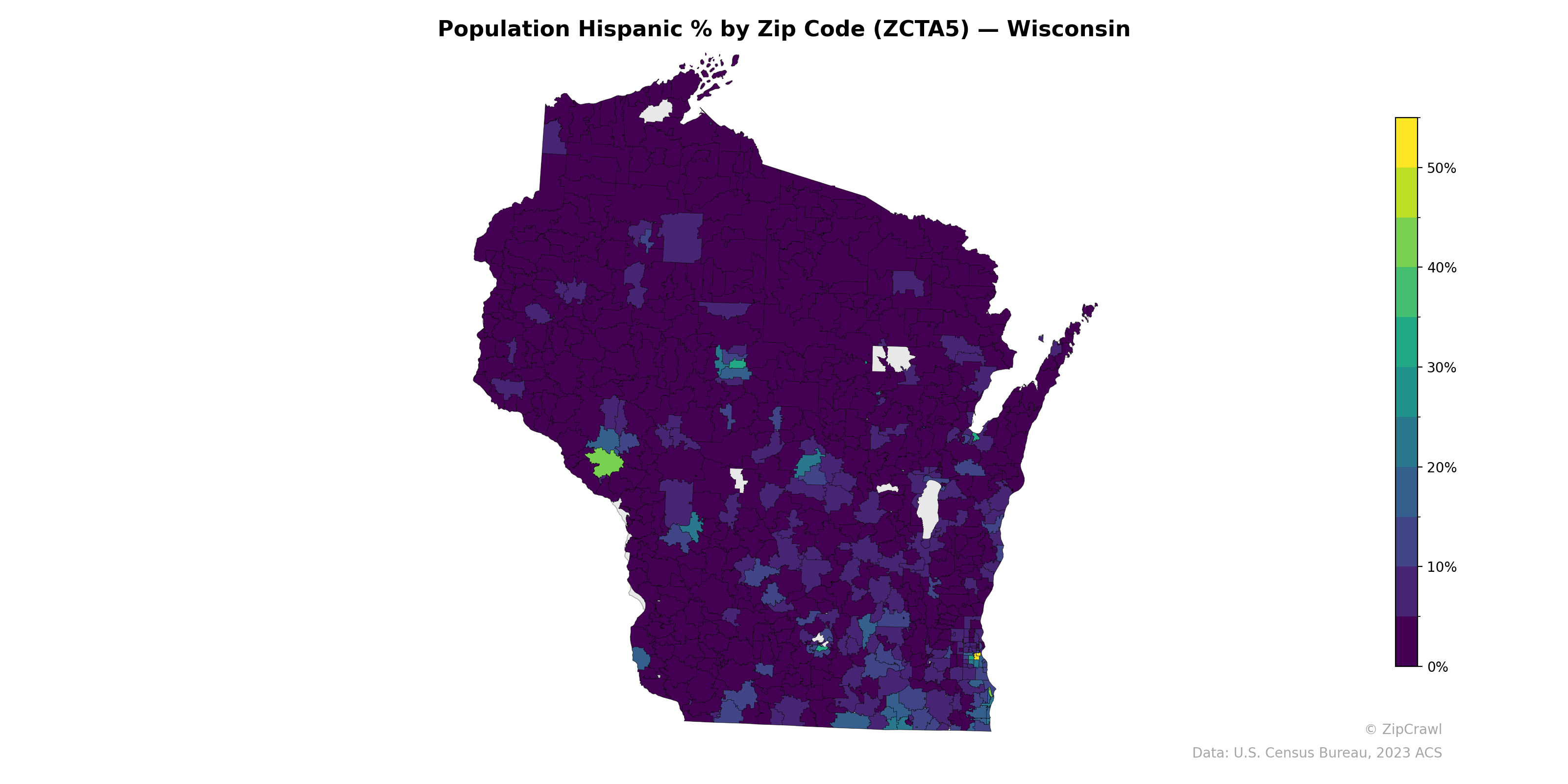 Hispanic population concentration in Wisconsin is highest in the western-central part of the state, where a distinct cluster near the La Crosse–Eau Claire corridor reaches approximately 40–50%, alongside scattered elevated zip codes in the central agricultural regions. The Milwaukee metropolitan area in the southeastern corner displays notable internal variation, with specific zip codes reaching 20–30% or higher adjacent to areas below 5%. The vast majority of northern and rural Wisconsin zip codes remain below 5% Hispanic, creating a stark contrast with the pockets of concentration in urban centers and agricultural communities across the central and southern portions of the state.