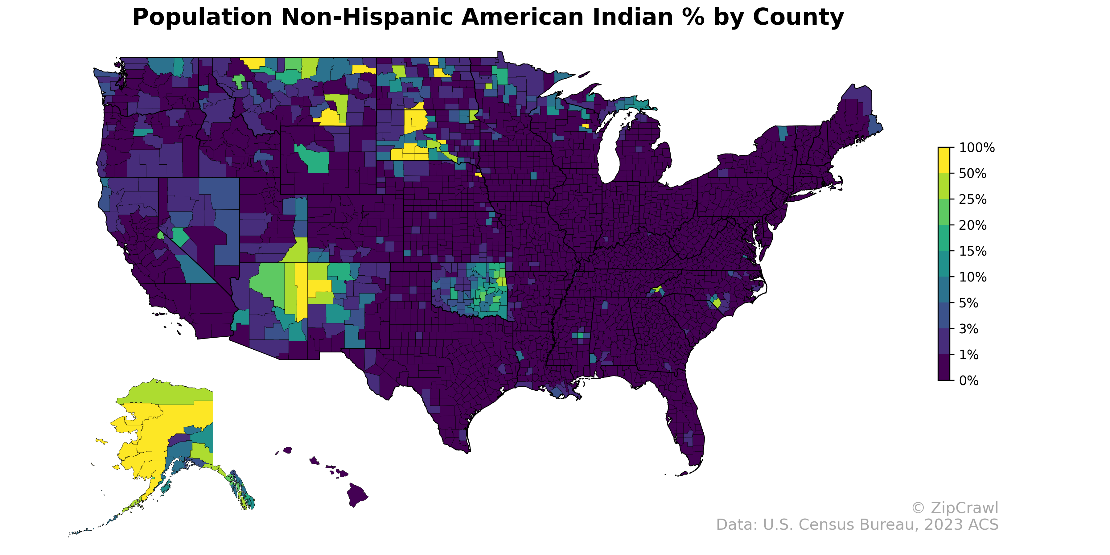 Map the geographic distribution of Native American populations and the enduring footprint of forced removal and reservation systems. This visualization reveals majority-Native counties across Alaska, the Southwest, and northern Great Plains - homelands that survived centuries of displacement - while vast purple regions across the East and South reflect the near-total erasure of indigenous populations through the Trail of Tears and earlier colonial violence.