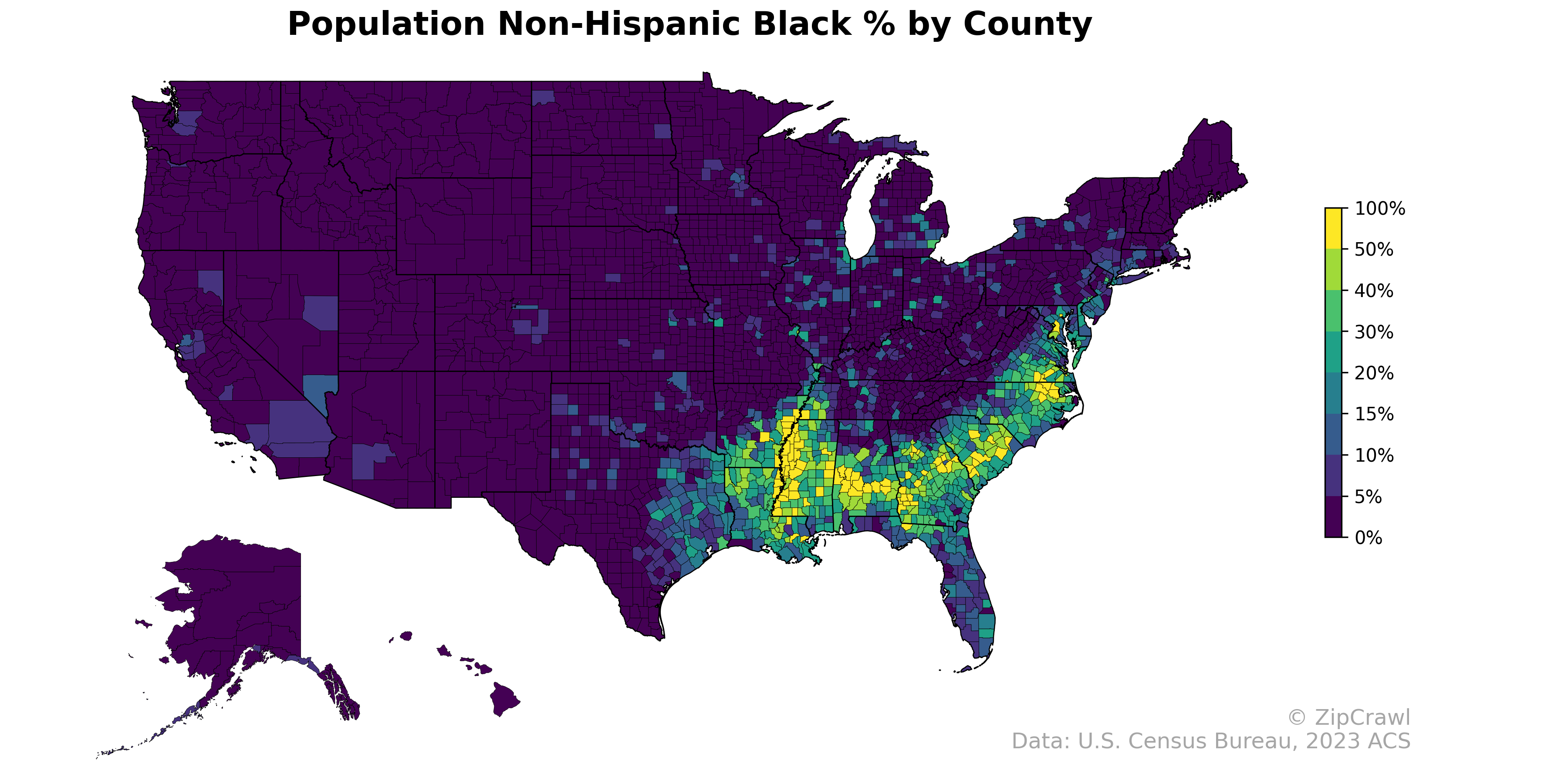 Trace the geographic legacy of slavery, the Great Migration, and ongoing demographic shifts in Black America. This map illuminates the historic Black Belt stretching across the Deep South, the industrial corridors of the Midwest and Northeast that drew millions northward, and the stark absence of Black populations across the Mountain West and Plains - regions that remained largely untouched by these transformative migrations.